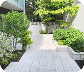 木杭は高さを調整することに加えて間に緑を挟むことで、圧迫感を感じさせず開放感のあるお庭に。アプローチは家の外観に合わせた色合いにし、まとまりのある空間となりました。